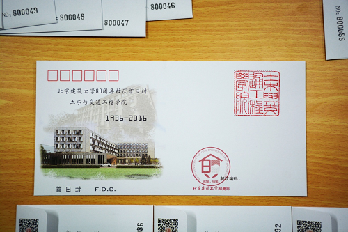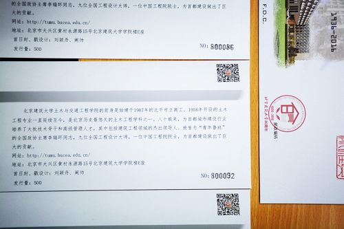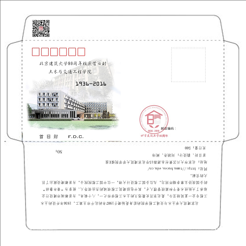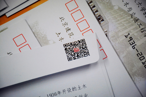 首日封的封口处,为土木学院公众号“北建土木”的二维码,校友可以通过扫描二维码关注学校、学院的相关信息。