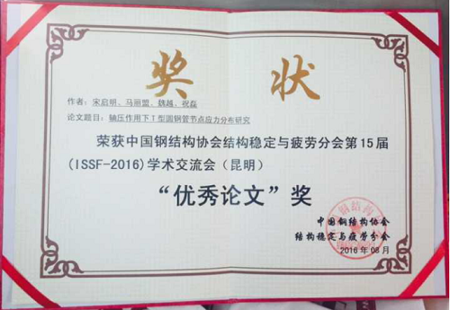 祝磊副教授指导的研究生宋启明提交的论文《轴压作用下T型圆钢管节点应力分布研究》获得会议“优秀论文”奖。本次会议通过“双盲”外审、《钢结构》编辑部终审,共评选出14篇会议优秀论文,优秀论文将在《钢结构》杂志正刊发表。
