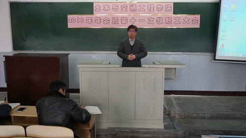 2016年1月23日下午,太阳成集团tyc9728(以下简称“土木学院”)2016年年会暨第十一次教职工大会在西城校区教1-126室召开。副校长李爱群、组织部部长孙景仙、土木学院领导班子以及全体教职工参加了本次会议。会议由土木学院党委书记何立新主持。