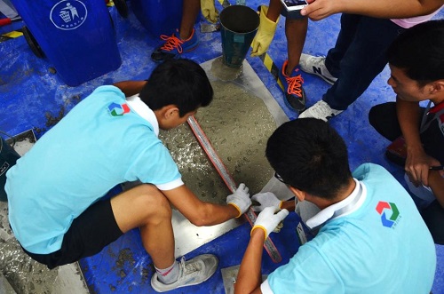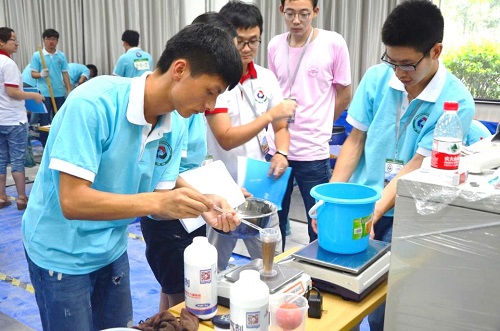 实际操作部分为现场混凝土配合比设计、拌和及性能测试。本次大赛设计主题是"C30大流态混凝土"。技术评议组和裁判组根据配合比设计的合理性、现场拌和操作的正确性、拌合物的工作性进行评分。学生们一边拿起计量器认真配比,一边抄起铁锨搅拌砂石,场面非常热闹。