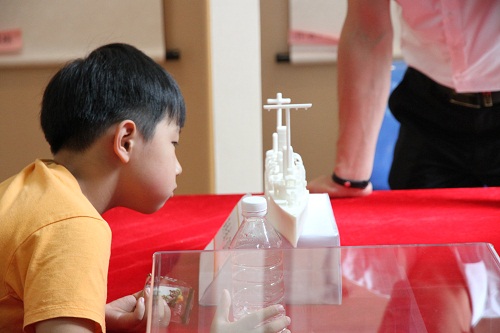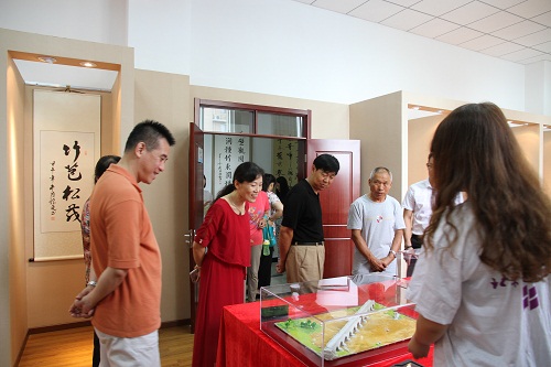 12件充满浓浓爱国情怀的抗战模型精致小巧,但都承载着厚重的历史。白墙黑瓦的中国人民抗日战争纪念馆模型体现出黑白分明的设计思想,而方正的建筑结构则暗含公正严明的设计理念,进而体现其历史事实不应被否认的民族希望。白色的瓦窑堡革命旧址模型,制作精良,比例协调,体现了建筑原有的神韵,从而向确定了建立抗日民族统一战线政策的瓦窑堡会议致敬。3D打印的中山舰模型威武雄壮,仿佛向人们诉说着那段不堪的历史。卢沟桥、拉贝故居、东北沦陷史陈列馆等一个个模型也都精巧迷人,吸引了大量的居民前来参观。有年过古稀的老人,潮气蓬勃的年轻人,还有由年轻父母带着的稚气未脱的孩子。大家纷纷感慨模型制作精美,同时更被模型承载的历史所吸引。在参观过程中,随着志愿者认真而又激情的讲解,参观者仿佛被带到了那个战火纷飞、国破家亡的年代,那屈辱的历史又一次浮现在人们面前。