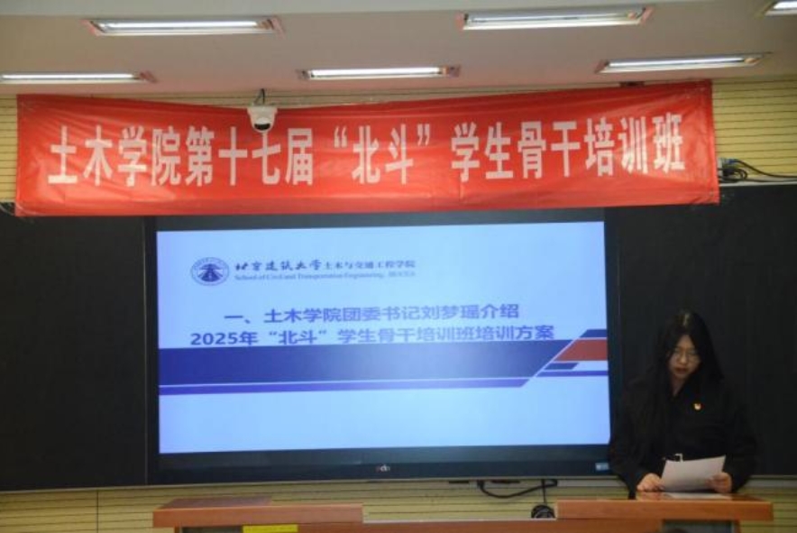 土木学院团委书记刘梦瑶介绍了本期培训方案。培训依托“北斗领航”育人体系,聚焦思想引领、组织建设与青年发展,以“体验式、训练式、实践式”为特色,设置“思想引领、工作技能、生动实践、成果展示”四大板块,通过主题团课、技能培训、雄安新区实践研学等方式,分层分类提升骨干综合能力。最后,她勉励学员要珍惜机会、学以致用。