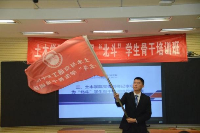 在全体骨干的见证下,土木学院党委副书记李守玉为第十七届“北斗”学生骨干培训班代表授旗。印有“北斗”字样的旗帜在现场挥动,标志着新一程骨干培养之旅正式开启。与会师生一同合影留念。