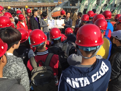 焦驰宇从桥梁整体上介绍大桥的结构,苏涛从建造过程、建造细节和建造中的一些常见问题及解决方法上进行介绍。登到桥面上,同学们直观看到国内新创的STC超韧性混凝土工艺技术施工过程。工艺材料结构致密、渗透性极小,可增强沥青与桥面的粘结性,大幅降低沥青层粘结失效、车辙、推移等破坏风险,避免反复维修。同时,可避免雨水渗透腐蚀钢桥面,阻止钢板疲劳开裂,大幅度提高桥面刚度和桥梁使用寿命。