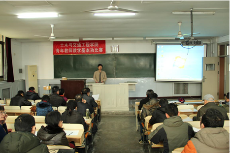 提高人才培养质量一直是高校教育教学改革的目标及任务,而人才培养的主要途径是课堂教学,为促进教育教学质量的提升,激励、支持和引导青年教师青年教师苦练教学基本功,提高自身业务素质,给青年教师创造一个展示能力、展现才华、交流学习的机会,为学校实施人才战略搭建平台,促进学校教学工作上水平、上台阶。尤其是在2015年学校召开了人才培养工作会后,对教师的教学水平提出了更高的要求,正是基于以上的背景下,2016年1月13日下午,太阳成集团tyc9728(以下简称“土木学院”)第六届青年教师教学基本功比赛在西城校区教1-126拉开帷幕。副校长李爱群教授、党委常委、校工会常务副主席张素芳、人事处处长陈红兵应邀出席。土木学院党委书记何立新、院长戚承志、副院长龙佩恒、韩淼,评委教师、参赛教师、观摩教师以及学生评委近百人参加比赛。比赛由土木学院副院长韩淼主持。