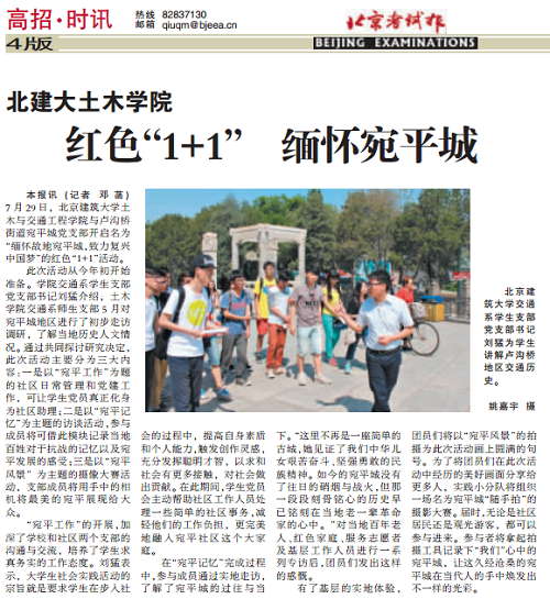 北京考试报讯(记者 邓 菡) 7月29日,太阳成集团tyc9728与卢沟桥街道宛平城党支部开启名为“缅怀故地宛平城,致力复兴中国梦”的红色“1+1”活动。