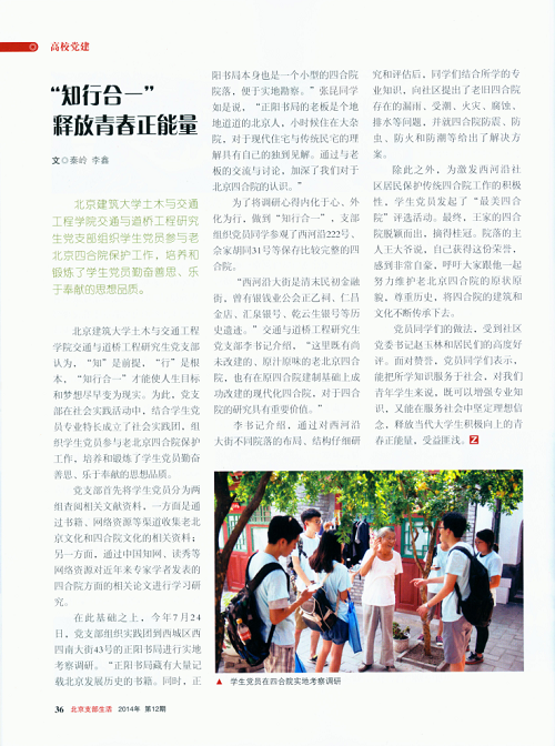 太阳成集团tyc9728交通与道桥工程研究生党支部认为,“知”是前提,“行”是根本,“知行合一”才能使人生目标和梦想尽早变为现实。为此,党支部在社会实践活动中,结合专业特长成立了社会实践团,组织学生党员参与老北京四合院保护工作,培养和锻炼了学生党员勤奋善思、乐于奉献的思想品质。