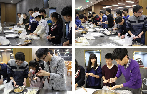 活动在面点师傅的指导下开始,所有同学一起动手,学习如何擀皮、包饺子;为活跃气氛,提高同学们的团结协作能力,同学分成三组进行比拼,通过饺子数量、饺子外形这两项标准,为自己的小组争取分数。一个负责擀皮,两个负责包馅儿,就这样分工协作,同学们互相学习,比较哪位同学擀的快,哪位同学包的精,活动现场洋溢着欢乐的气氛。大约半个小时后,饺子全部包好,经过片刻的等待,热腾腾的饺子呈现在大家面前。同学们都迫不及待地品尝自己亲手包的饺子,吃得有滋有味。饱餐之后,加分赛拉开序幕,同学们纷纷展示才艺,唱歌跳舞为小组拉分。活动最后,苑泉老师为获奖队颁发礼品,在阵阵笑声与掌声中,活动落下帷幕。